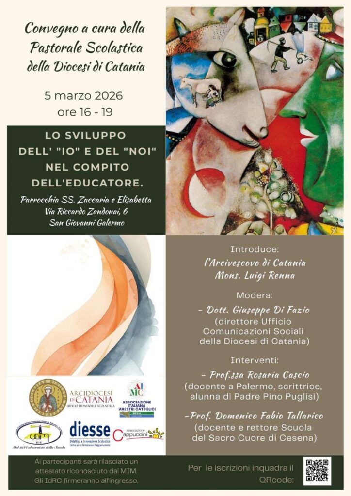 L’Ufficio di Pastorale Scolastica dell’Arcidiocesi di Catania invita docenti, educatori e cittadini al convegno dal titolo “Lo sviluppo dell’’Io’ e del ‘Noi’ nel compito dell’educatore”. Un momento di riflessione profonda sulle sfide educative contemporanee e sulla costruzione del senso di comunità.