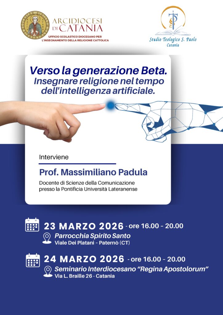 L’Ufficio Scolastico Diocesano organizza un seminario di approfondimento dedicato alle nuove sfide educative: “Verso la generazione Beta. Insegnare religione nel tempo dell’intelligenza artificiale”. L’incontro sarà guidato dal Prof. Massimiliano Padula, docente presso la Pontificia Università Lateranense. L’appuntamento si sdoppia in due date: il 23 marzo a Paternò e il 24 marzo 2026 a Catania, sempre dalle ore 16:00 alle 20:00.