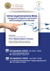 L’Ufficio Scolastico Diocesano organizza un seminario di approfondimento dedicato alle nuove sfide educative: “Verso la generazione Beta. Insegnare religione nel tempo dell’intelligenza artificiale”. L’incontro sarà guidato dal Prof. Massimiliano Padula, docente presso la Pontificia Università Lateranense. L’appuntamento si sdoppia in due date: il 23 marzo a Paternò e il 24 marzo 2026 a Catania, sempre […]