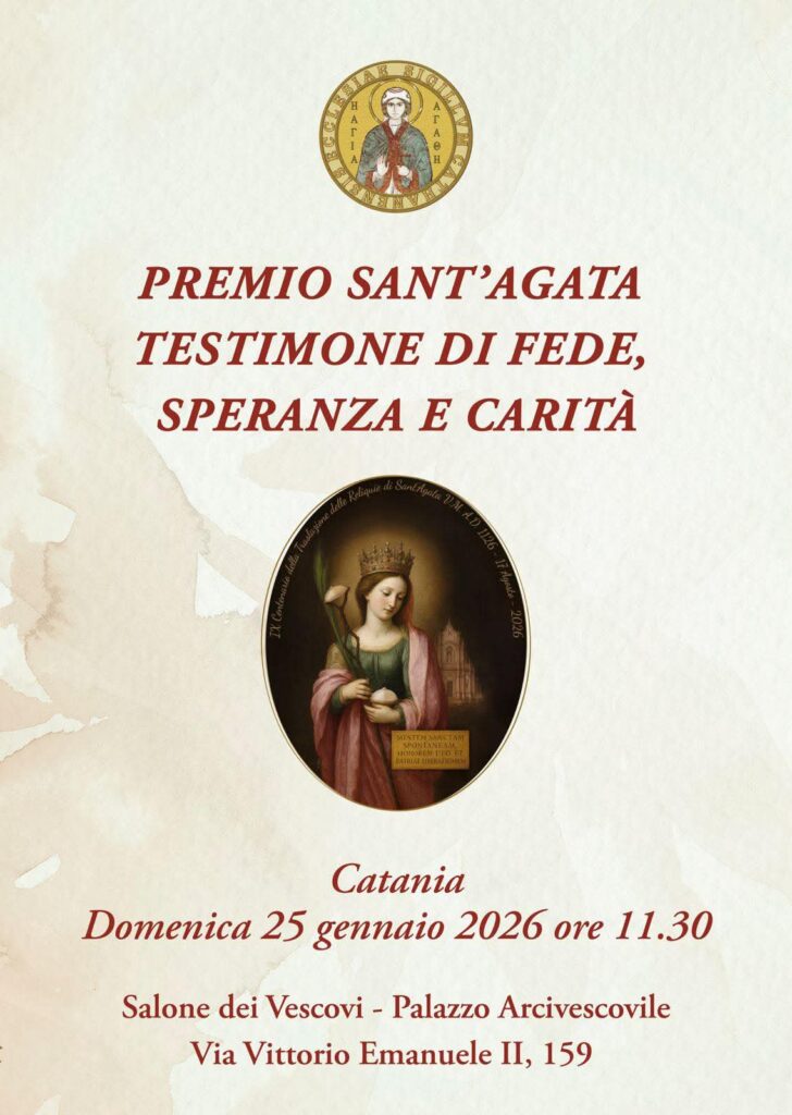Premio Sant’Agata – Testimone di fede, speranza e carità La Chiesa di Catania comunica il conferimento del Premio Sant’Agata – Testimone di fede, speranza e carità, promosso per valorizzare esempi significativi di testimonianza cristiana ispirati alla vita e al martirio della Santa Patrona. Il Premio è stato istituito per volontà di S. E. Mons. Luigi Renna con l’intento di riconoscere…